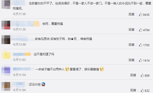 然而等了几个月,大家发现他俩并没有分手,就开始对张子枫怒其不争,唯有“锁死尊重祝福”了,大家口风一变,又开始说“别再替女方鸣不平了”、“不是一家人不进一家门”、“一床被子睡不出两种人”。