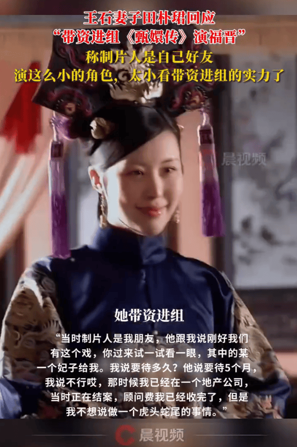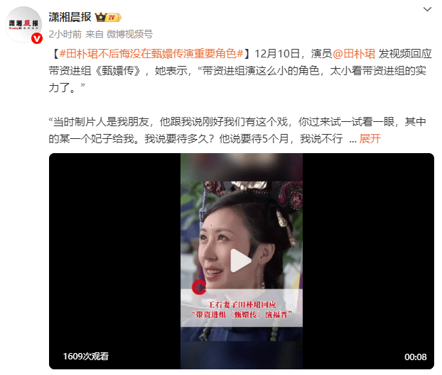 (来源:潇湘晨报综合读特新闻、九派新闻)12月10日,演员田朴珺发视频回应带资进组《甄嬛传》,她表示,“带资进组演这么小的角色,太小看带资进组的实力了。”“当时制