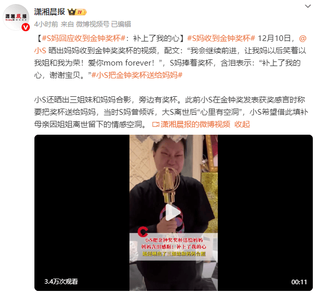 (来源:潇湘晨报)12月10日,小S晒出妈妈收到金钟奖奖杯的视频,配文:“我会继续前进,让我妈以后笑着以我姐和我为荣!爱你mom forever!”,S妈捧着奖杯,含泪表示:“补上了我