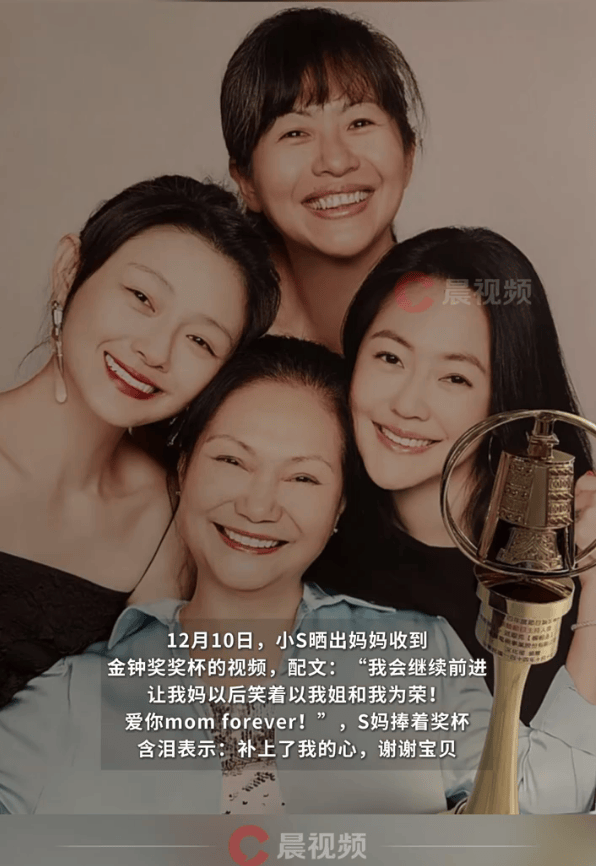12月10日,小S晒出妈妈收到金钟奖奖杯的视频,配文:“我会继续前进,让我妈以后笑着以我姐和我为荣!爱你mom forever!”,S妈捧着奖杯,含泪表示:“补上了我的心,谢谢宝贝。”