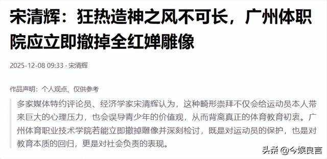 直言"教育机构更应倡导理性价值,而非参与造神运动,应立即拆除全红婵雕像"。