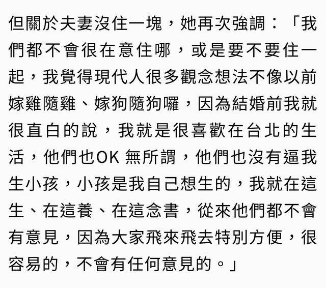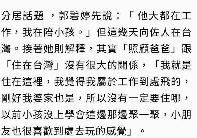 她表示2024年初举家迁回台北,并非网上传言的“婚姻破裂”,而是郭碧婷本身就是喜欢住这里台北,结婚的时候就谈过这个问题,婚后是要搬回台北的。
