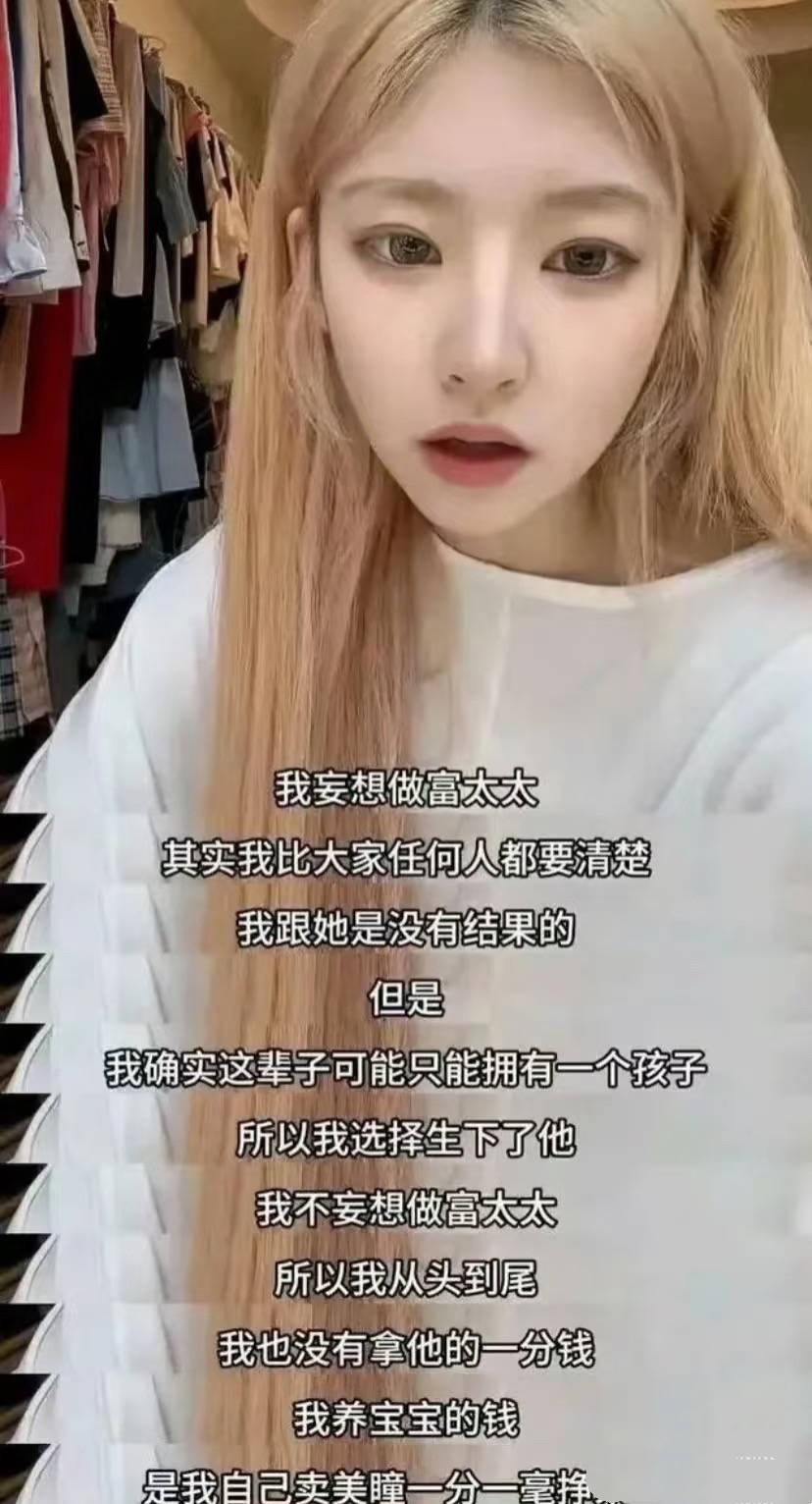 生孩子的原因,是因为自己这一辈子可能只会拥有这一个孩子。如果不生孩子,以后就没机会了。而且她养孩子的钱,都是靠自己卖美瞳、护肤品赚来的。