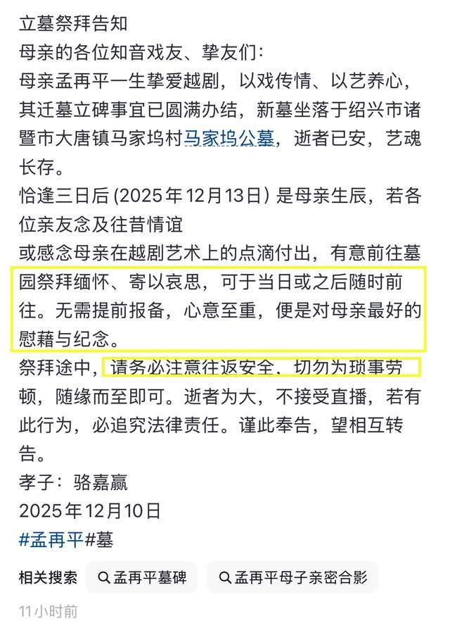 她的儿子小骆特地在12月10号发文称,若亲友念及往昔情谊,可以不用报备前往其墓地悼念,并希望悼念的人员能够注意安全,现场不会接受直播。