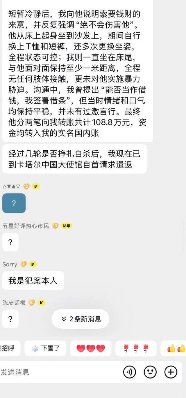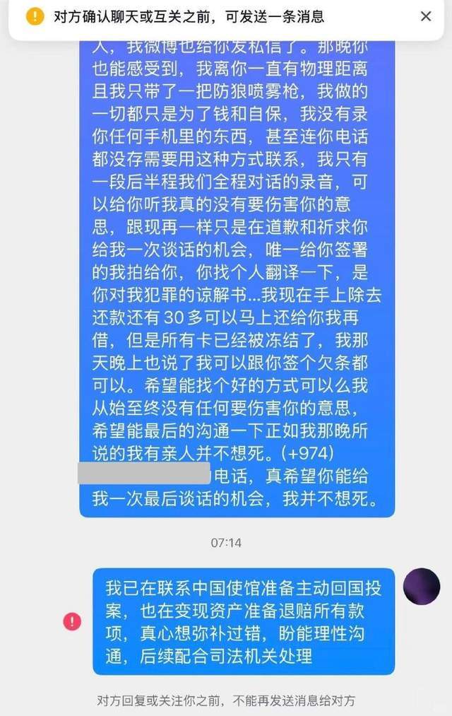事后,该嫌疑犯想过自杀,也曾联系蓝战非私了,但最终还是决定向卡塔尔中国大使馆自首,并要求遣返。