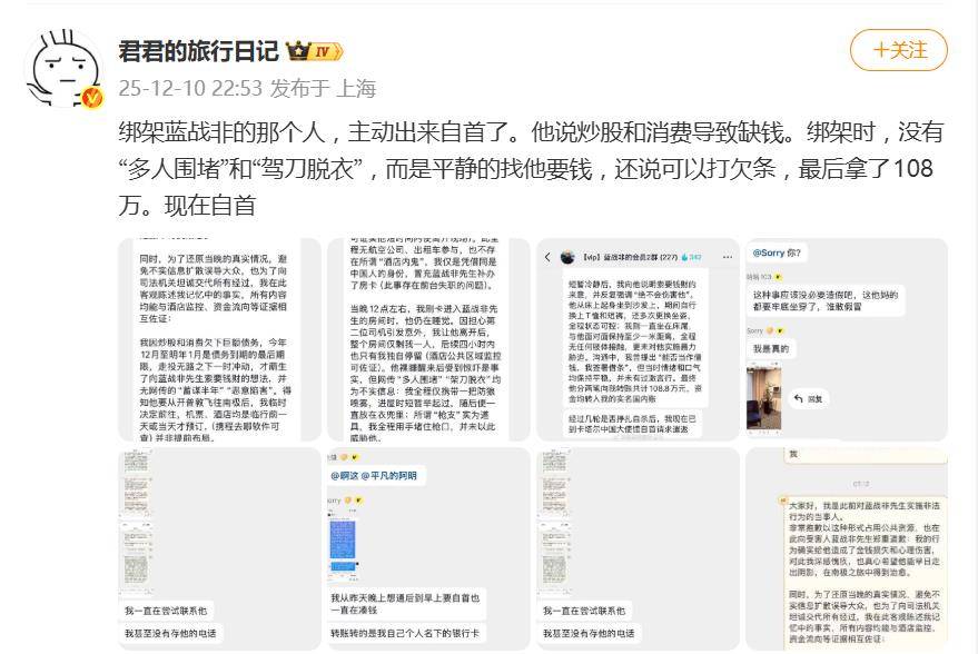 据这份12月10日流传的声明所述,嫌疑人自称因炒股和消费欠下巨债,在走投无路之下临时起意,锁定了蓝战非为目标。他声称通过蓝战非的社交动态,获悉其从南非开普敦飞往南极的行程,并在临行前一天仓促订票,前往机场蹲守三天,最终尾随至酒店。