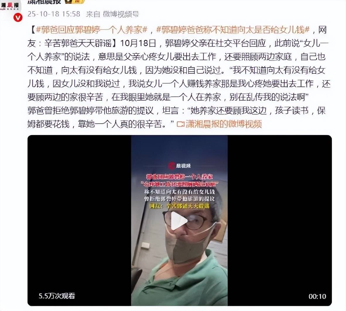 然而,这场“养家”风波的另一端,连接着郭父此前引发的舆论涟漪。10月18日,郭父曾在社交平台紧急回应,晒出佩戴氧气管的照片并解释是“刚装完支架后还需要,现在不用了”。在评论区,他针对“女儿一个人养家”的说法划清界限:“我不知道向太有没有给女儿钱,因女儿没和我说过。”他澄清,自己之前的言论纯粹是出于父亲的心疼,“心疼她要出去工作,还要顾两边的家很辛苦”。在他眼中,女儿“就是一个人在养家”。