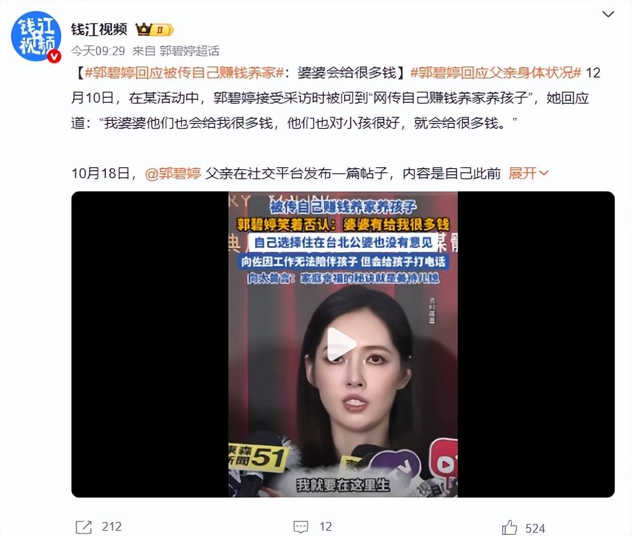 12月10日,郭碧婷在活动采访中,正面回应了近期围绕其“一人赚钱养全家”的传闻。面对网络关于养娃费用均由其承担的猜测,她笑着澄清:“不会啊,婆婆他们也会给我很