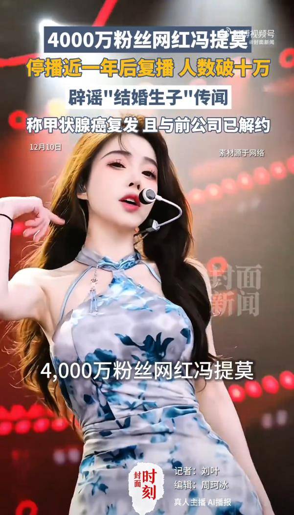 12月10日,冯提莫在复播中首次详细透露,过去一年的沉寂源于甲状腺癌复发,且发生了病灶转移。她表示已及时进行了手术切除与清理,目前身体状态稳定。与此同时,她也正面辟谣了期间关于她结婚生子的种种传闻。这不是她第一次与病魔公开交手——早在2023年7月,她就曾因甲状腺癌接受手术并成功恢复嗓音,当时还呼吁公众关注心理健康。