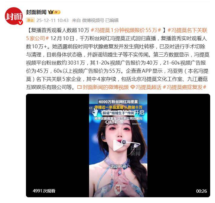 从“斗鱼一姐”到跨界歌手,再到与病魔缠斗的“抗癌战士”,冯提莫的身份始终在叠加。如今,“甲状腺癌复发”的病史与“55万每分钟”的报价并列,让她的人物故事更加复杂。这不再只是一个关于健康或娱乐圈的简单话题,而成了一个关于当代网红生态的缩影——在这里,个人叙事、公众情感与赤裸的商业价值,紧密交织,难以剥离。