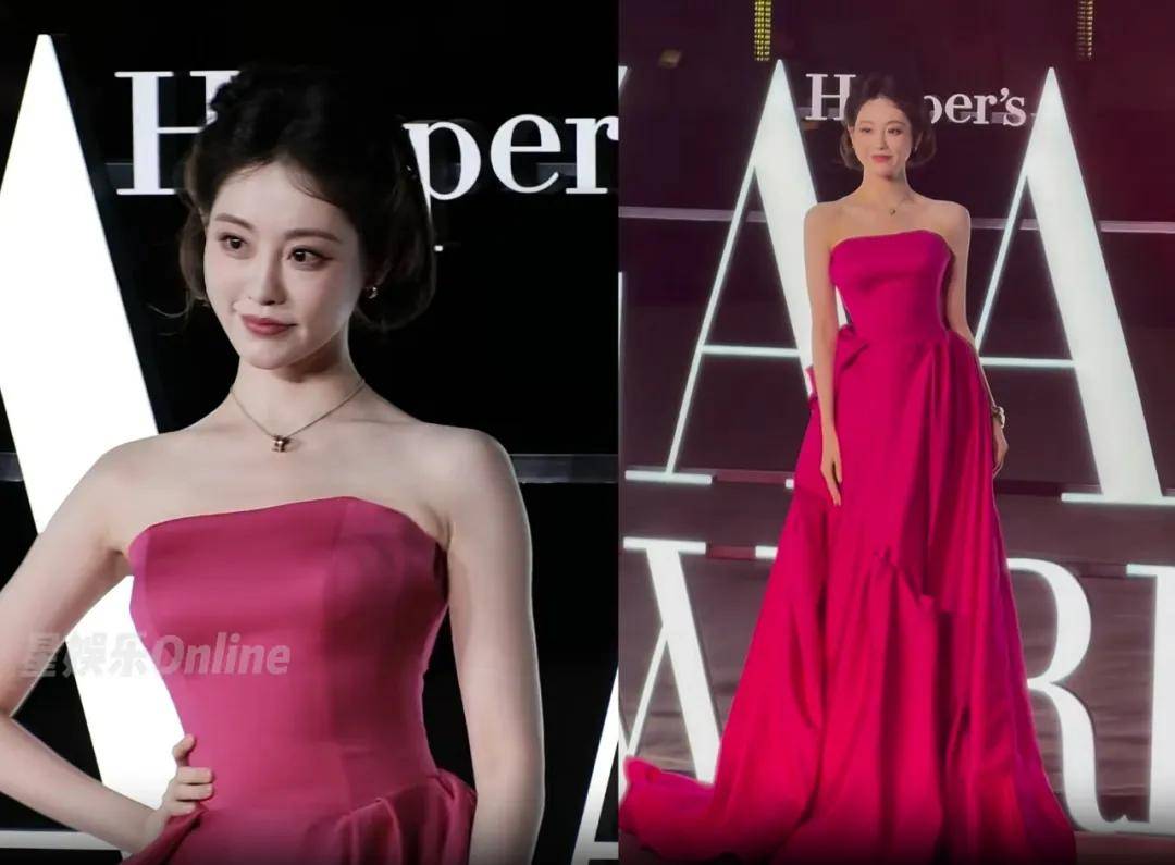 祝绪丹穿了一条不容易驾驭的玫红色抹胸长裙,而肤色偏白的她显然成功驾驭了。比起平时的甜美,这次她的红毯造型反而多了一些可爱。