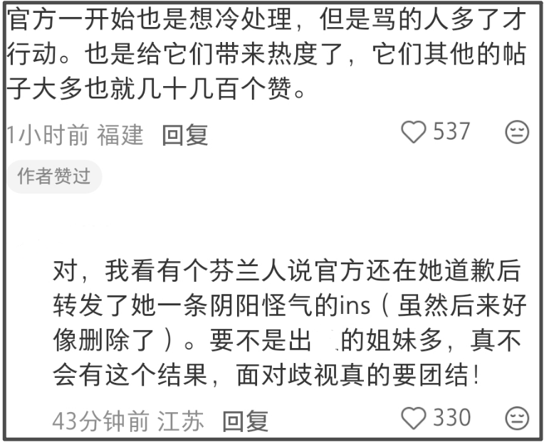 另外,不得不提的是,其实芬兰小姐比赛主办方的态度变化也很微妙,从Sarah拉眼角到取消Sarah冠军头衔,期间拉扯了超过一周时间,主办方并没有第一时间进行处理,还多次敷衍回应,多亏了许多网友坚持不懈,主办方才有了动作。
