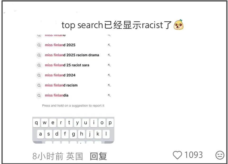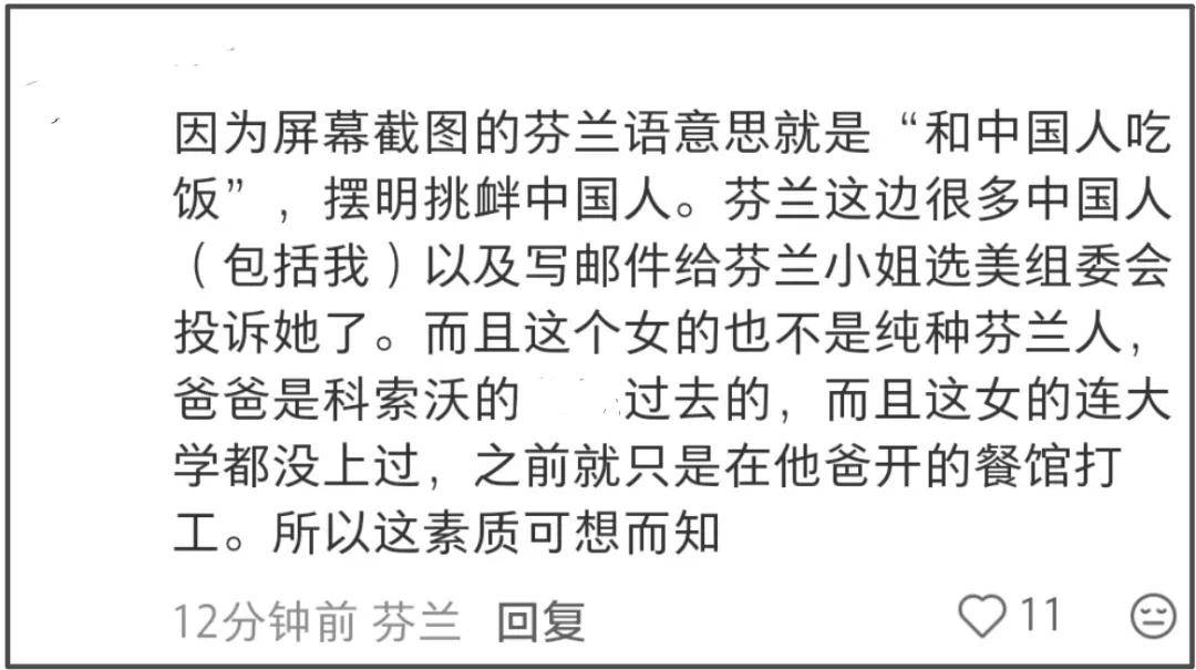 要知道Sarah作为芬兰小姐,可是代表了芬兰参加2025年环球小姐总决赛的,她的行为让网友开始质疑起了芬兰本地对亚裔(特别是中国人)的态度,越来越多网友参与发声,尝试联系芬兰小姐选美比赛主办方,要求Sarah道歉。