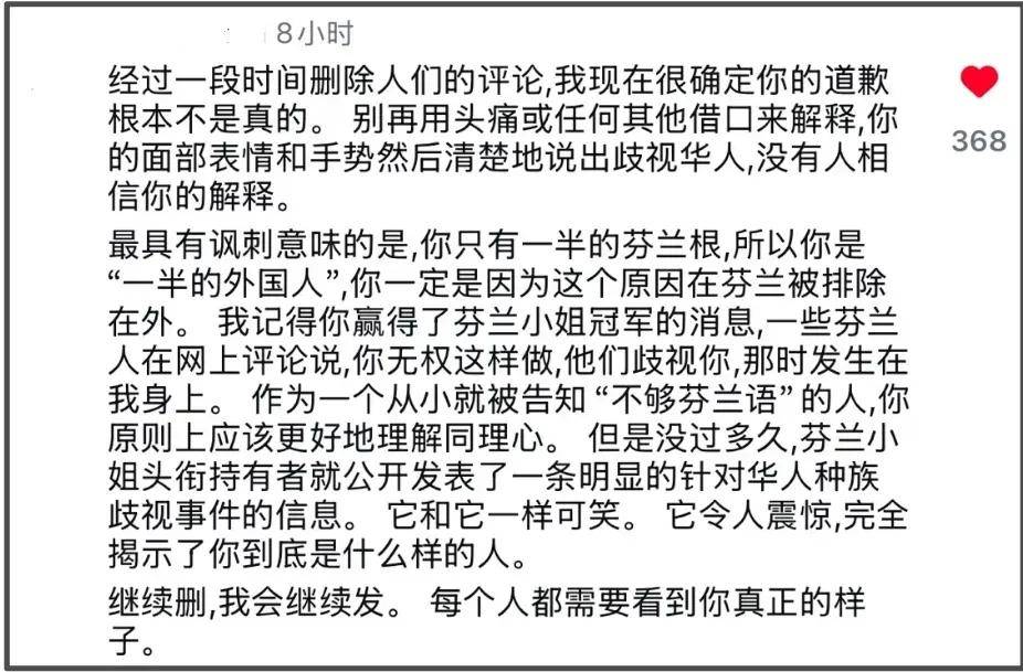 随着Sarah和芬兰选美比赛主办方评论区沦陷,他们终于联合发布了一篇道歉动态,只是Sarah的道歉毫无诚意,她依旧不承认自己存在歧视行为,狡辩是因为文化差异引发了误会,还数次强调自己配得上芬兰小姐称号。