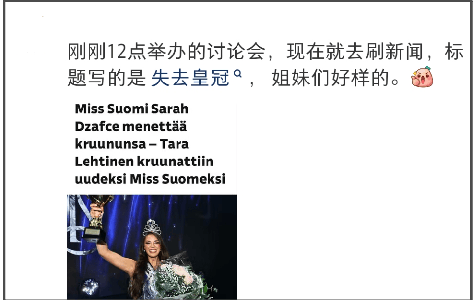 目前Sarah已经登上了芬兰媒体头条,当地媒体都在强烈谴责她的歧视行为,Sarah也不再是芬兰小姐了,选美比赛主办方干脆开了换人直播,当场把象征着芬兰小姐的桂冠给了别人。