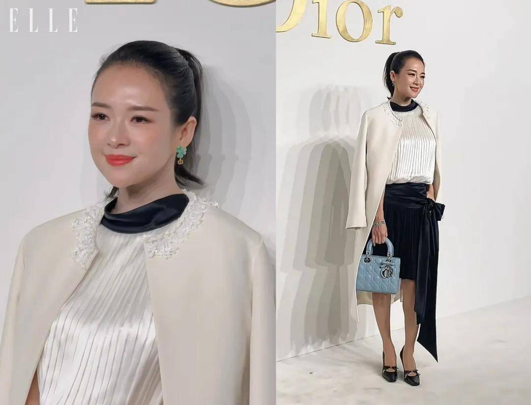 章子怡穿的是黑白撞色上衣搭配黑色半裙,外披一件白色外套,看起来成熟优雅,比前几天那套粉色长裙的造型好看不少。