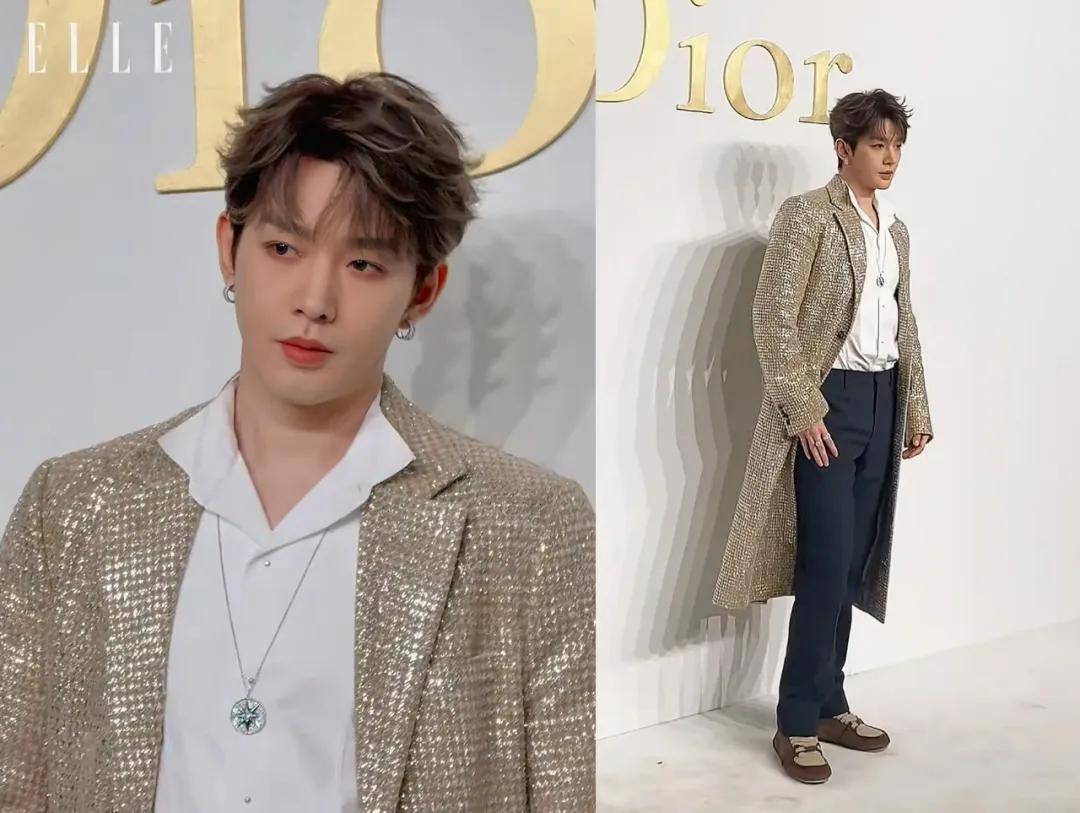 邓为穿了一件闪亮的金色中长款外套,搭配挑染的金发很华丽。不过他的脸比起之前在剧里的样子,稍稍圆润了一些。