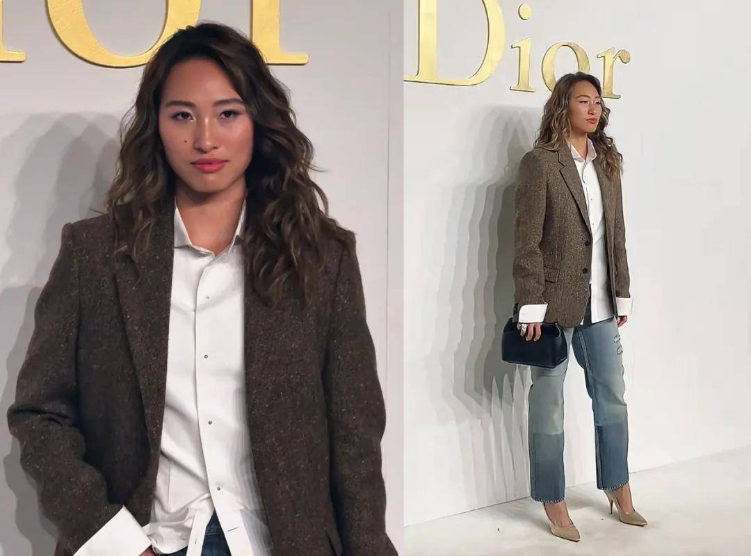郑钦文毕竟有身高优势,再加上自身气质好,所以哪怕穿的是偏基础的休闲穿搭——棕色西装外套、白衬衫以及牛仔裤,也给人霸气十足的感觉。