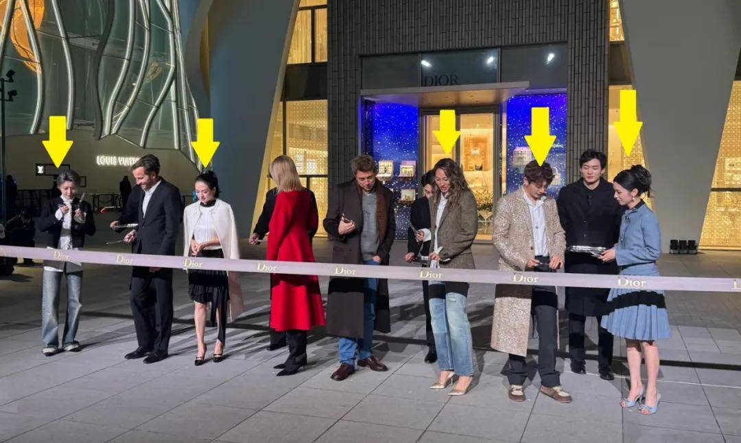 最后的剪彩仪式,并不是所有明星一起上阵,而是只有5位明星参与。其中,章子怡和郑钦文分别站在品牌老总的女儿以及创意总监身旁,刘雨昕以及邓为、周也则分别站在两旁。