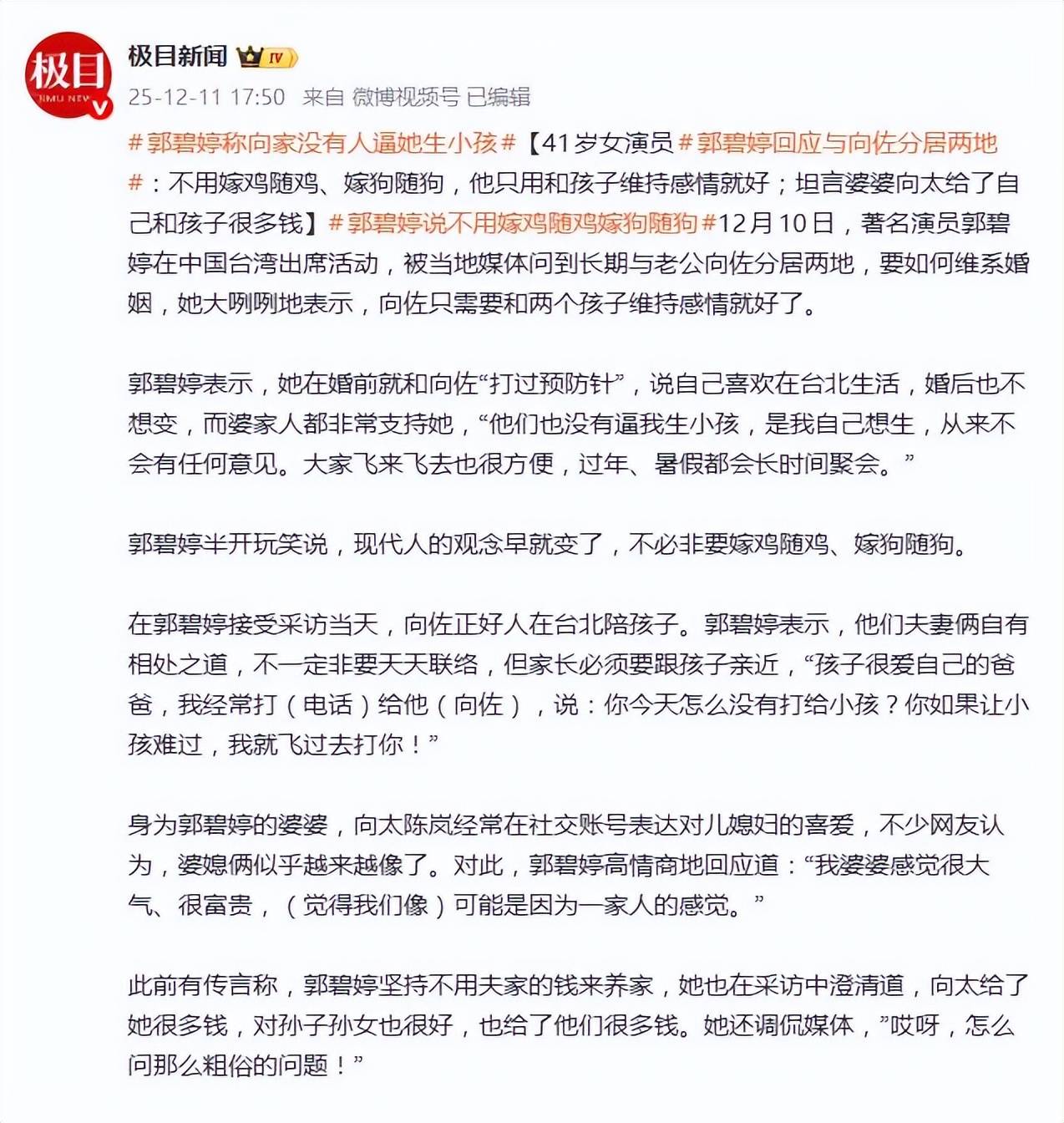 这番“亲子优先论”的背后,是她早已奠定的家庭格局。郭碧婷明确表示,定居台北是自己的坚定选择,源于对当地生活节奏和教育环境的偏爱。所幸,这份坚持在婚前就“打过预防针”,并获得了夫家——包括公婆向华强、陈岚夫妇及向佐本人的一致尊重。于是,形成了她携子女常驻台北,向佐因工作重心在内地而两地分居的模式。双方依靠视频维系日常,并利用过年、暑假等长假团聚,在她看来,“大家飞来飞去也很方便”。