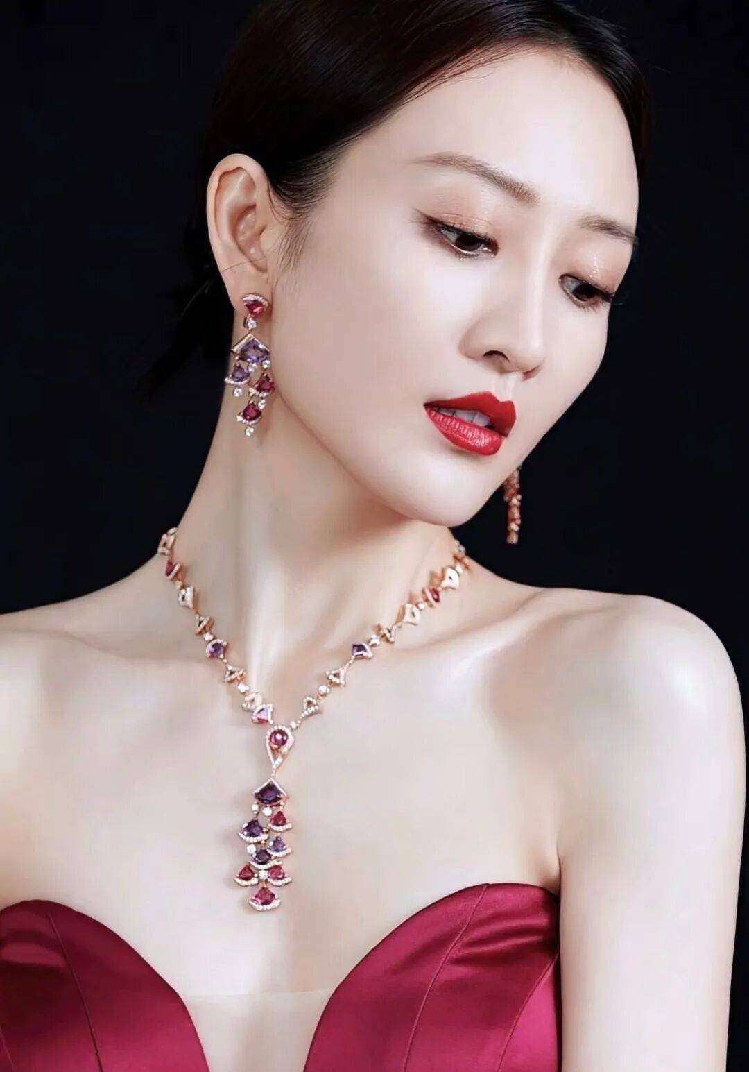 王鸥穿着红色抹胸衣裙,她俏脸清丽,秀眸明亮,长发盘起,露出白皙的香肩和事业线,魔鬼身材尽显无疑,绝对性感火辣!