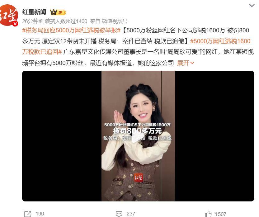 近日,拥有超5000万粉丝的短视频平台顶流“周周珍可爱625”(本名周珍),其名下控股公司因涉嫌逃税被依法查处。经国家税务总局佛山市税务局第一稽查局查明,该公司通过在账簿上不列或少列收入,逃避缴纳税款高达1600万余元,最终被追缴税款并处以800余万元罚款。12月11日,税务部门证实该案已查结执行完毕。