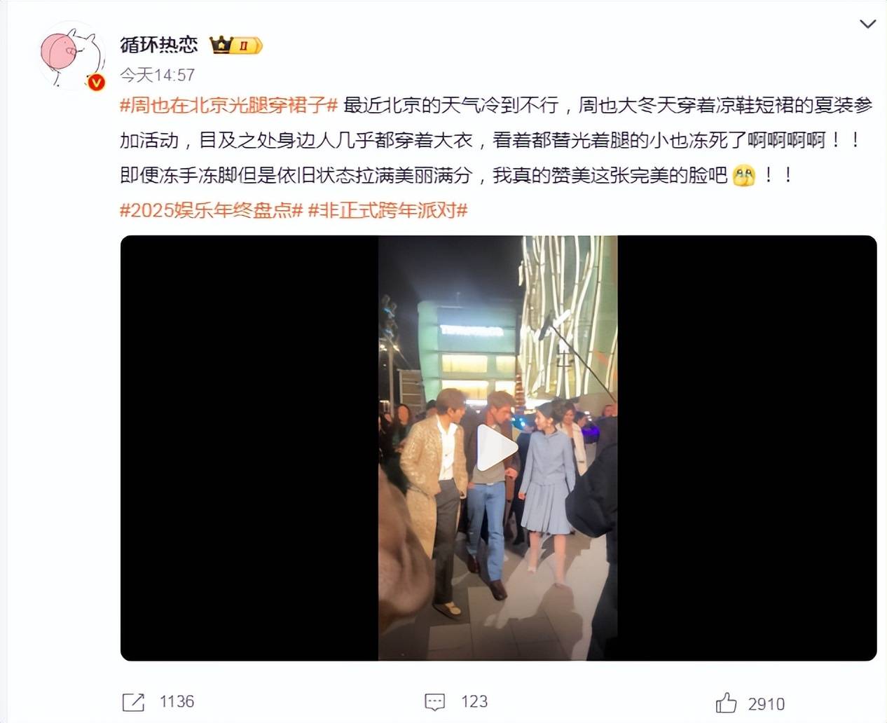当日北京气温低至零下三度,现场工作人员和嘉宾大多穿着羽绒服,而她腿部完全裸露,画面反差迅速引爆话题#周也在北京光腿穿裙子#。