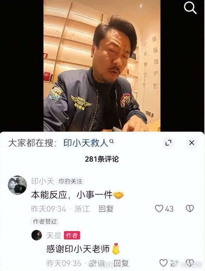 印小天于12月10日在宋先生致谢视频评论区留言:“本能反应,小事一件”,未主动宣扬事件,后续仍分享景区风光内容。