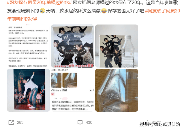 2005 年 8 月 21 日,何炅携专辑《漫游》在哈尔滨举办歌友会。活动结束后,一名粉丝发现现场遗留的何炅喝剩的半瓶纯净水,联想到 “猫王遗物拍卖” 事件后决定收藏。该粉丝称自己是与其他歌迷争抢后 “拼命护住” 了水瓶。初期,她将水瓶存放于冰箱,8 年前搬家时封存于老房北阳台。据其所说,20 年来水质仍保持清澈。同时,该粉丝还保留了何炅签名海报、现场条幅照片等,这些物品共同构成了其青春记忆的载体。