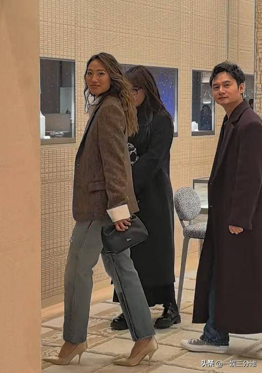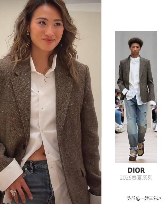 郑钦文这次身穿男款的棕色西装,蓝色牛仔裤搭配着高跟鞋,女穿男装只有身高178cm的郑钦文能撑起来吧。
