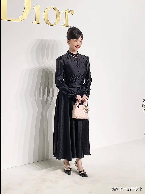 同样被邀请出席活动的“人间富贵花”景甜,盘发斜刘海,身穿黑色波点连衣长裙。