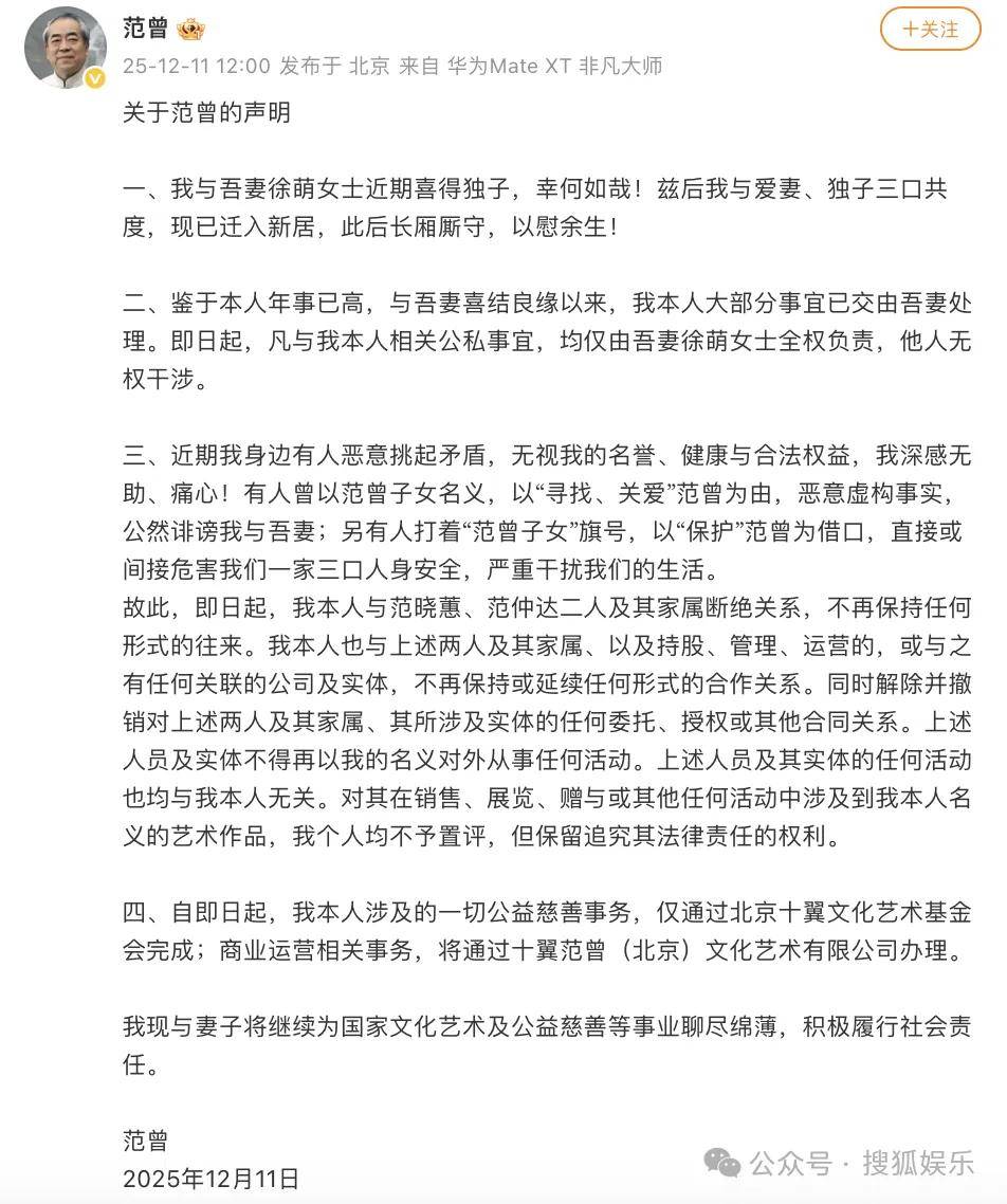 2025年12月11日,书画界传来一则令人惊讶的消息——以诗书画三绝闻名的87岁的中国著名当代书画家、学者范曾老爷子↓通过一纸手写声明宣布与37岁的妻子徐萌&ld