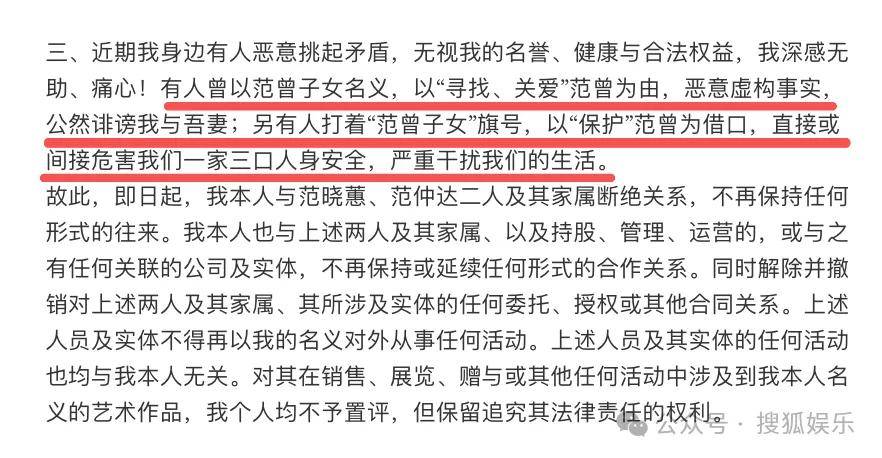 谁知声明后半段突然画风一转,范老爷子就明确表示要和女儿范晓蕙、继子范仲达两家“断绝一切关系往来”了。