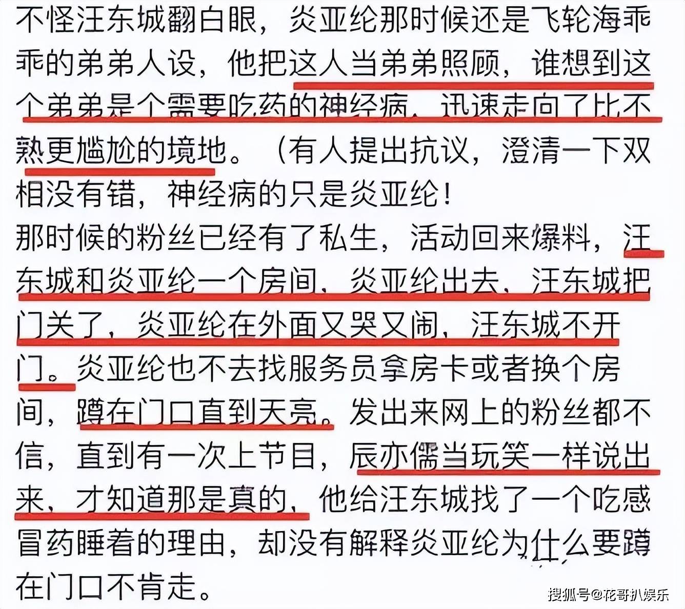 后来私生爆料说炎亚纶不仅不愿意进房间,甚至在外面又哭又闹,就要守着汪东城。汪东城估计那时候发现不对劲了吧。