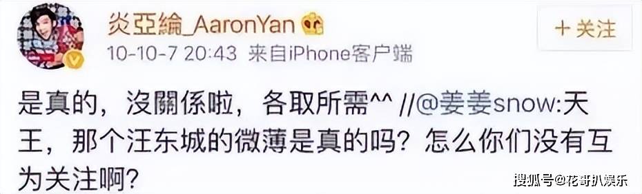 炎亚纶三天两头在微博上对汪东城示爱,但汪东城连个关注也不给,说不定早就拉黑了。