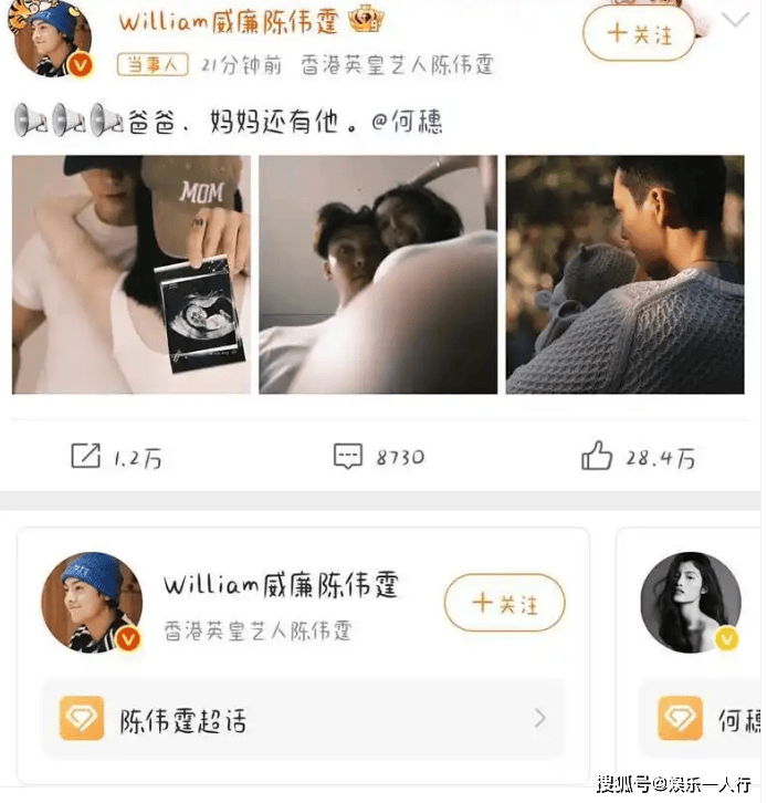10月18日,陈伟霆与何穗发文,官宣二人生子的消息。