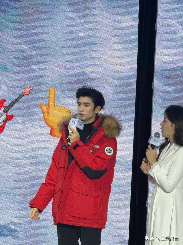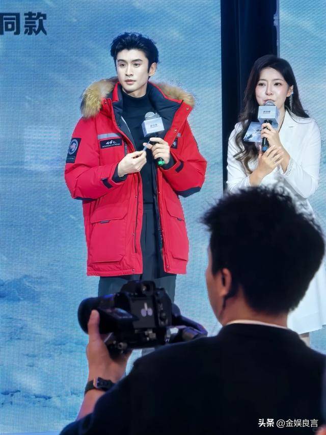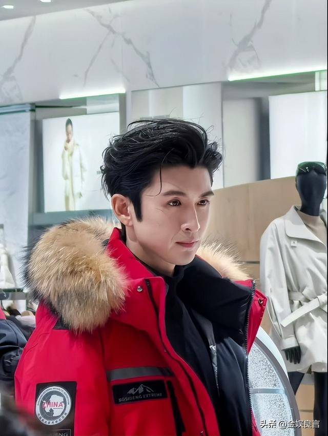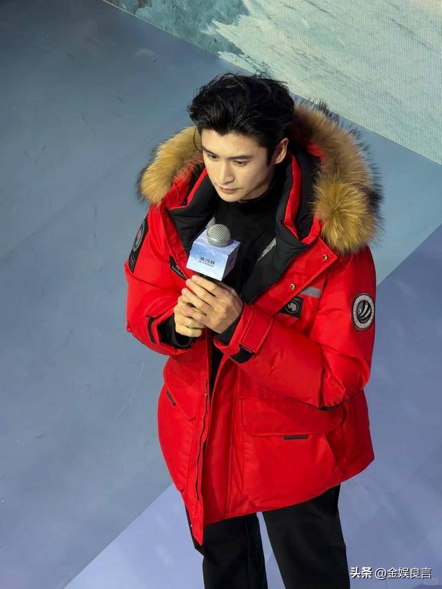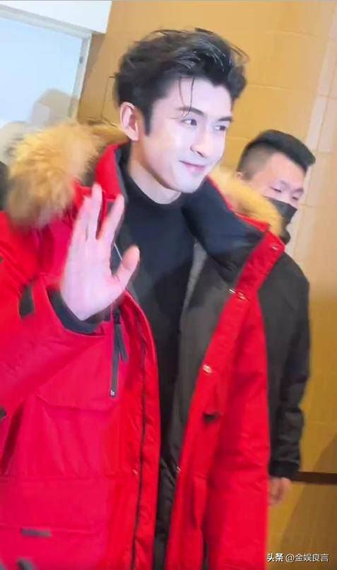 他身着一件红色棉袄,款式略显老气,与以往时尚形象反差极大。