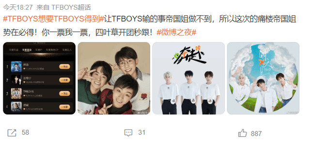 本届微博之夜的热度和关注度是非常高的,因为发生一件有趣的事情。12月9日,帝国姐发现TFBOYS进入榜单,如果获得第一名,可以获得2026年线下活动权益,看到这样的奖励后,帝国姐立即开始打投,所以在无官方号召、无大粉组织的情况下,帝国姐自发投票,仅仅用48小时,就将TFBOYS超话排名从148名冲到第4名。