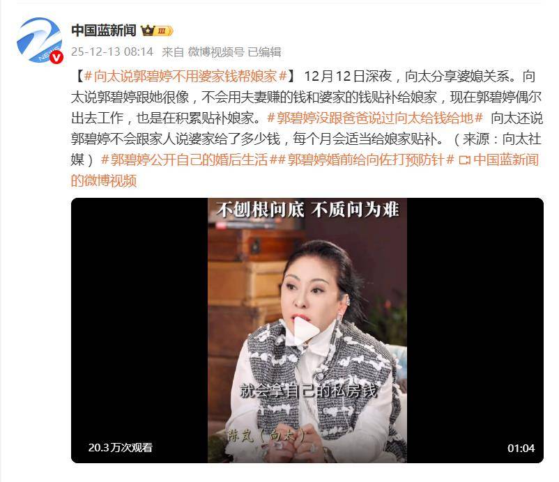 据12月13日报道,向太在直播中毫不吝啬对儿媳的赞赏,直言郭碧婷和自己年轻时理念一致——坚决不动用夫妻共同财产或婆家资金来补贴娘家。 按照向太的说法,郭碧婷父亲医疗费和娘家的日常开销,全靠她自己“偶尔出去工作”赚取,接综艺、拍广告的收入成了她反哺娘家的唯一来源。