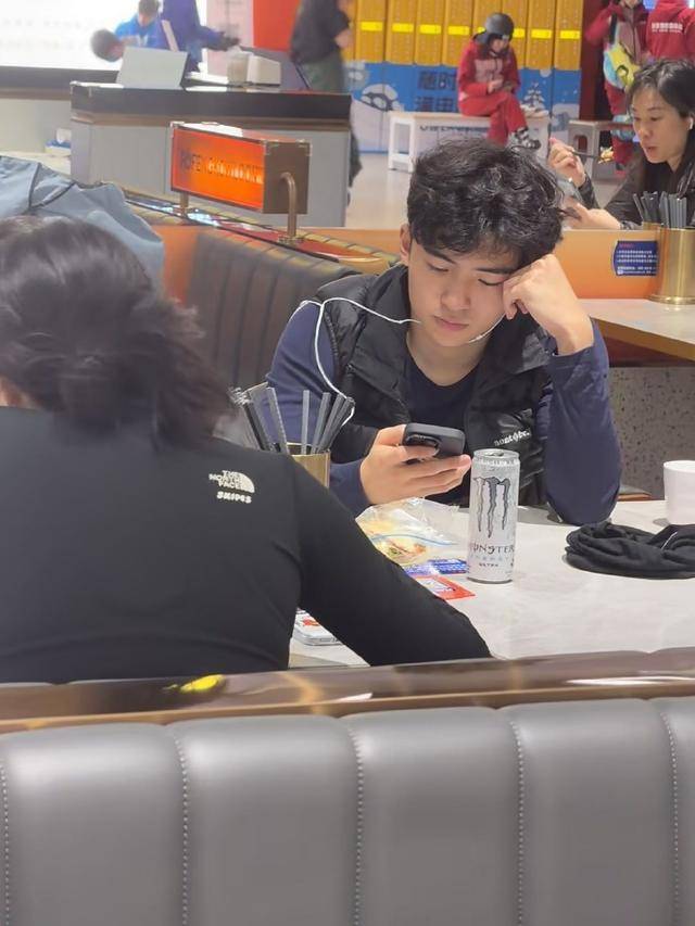 这不,12月13日有人在深圳滑雪场看到他,当时他正坐在桌子旁吃三明治,一边玩手机一边听音乐,戴着耳机,看起来挺酷的。