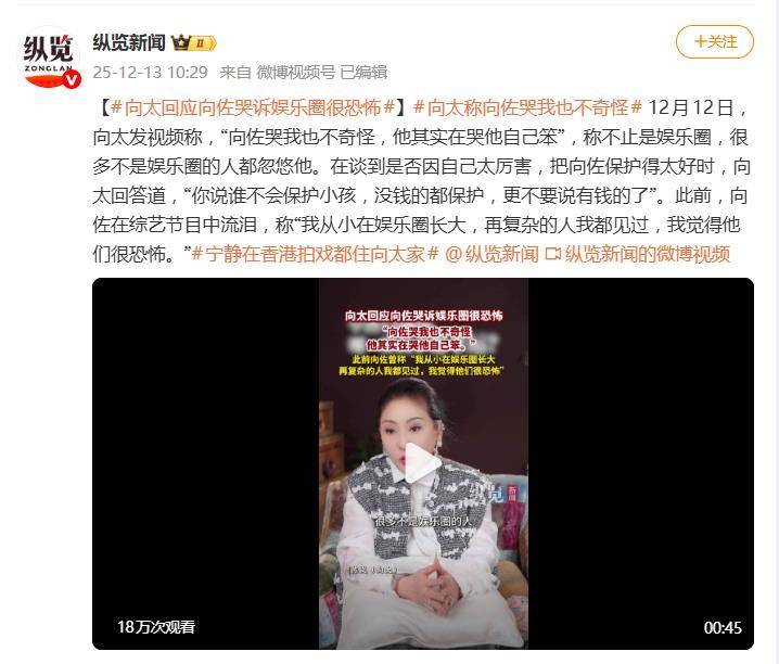 据12月13日报道,向太陈岚一段点评儿子向佐的短视频,又给娱乐圈话题添了把猛料。面对向佐此前在综艺里流泪感慨“娱乐圈的人很恐怖”,向太的回应直接又犀利:“他哭我也不奇怪,他其实在哭他自己笨。”