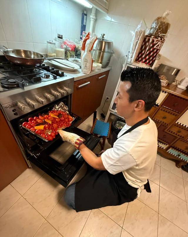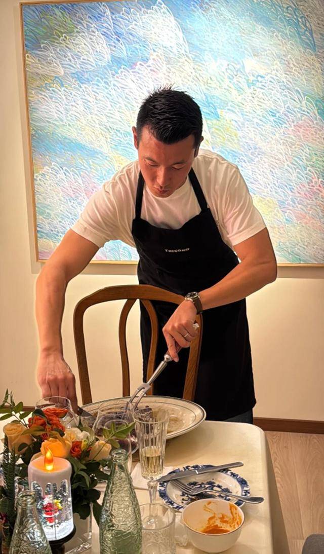 照片里王昀佳穿着白色 T 恤,围着黑色围裙正在切牛肉,手臂肌肉线条清晰可见,看起来就很有力量感。