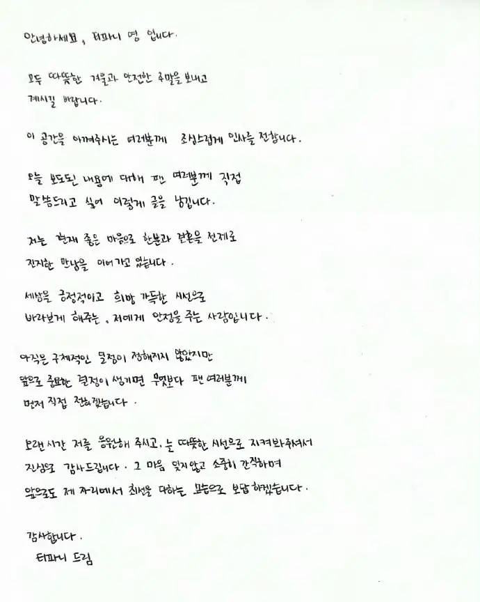 13日,少女时代Tiffany在ins上传亲笔信回应与卞耀汉恋情,“现在的我正以积极的心态,和一个人以结婚为前提真挚地交往中”,她还称没有确定具体日期,如果未来决定了会最先告诉粉丝。