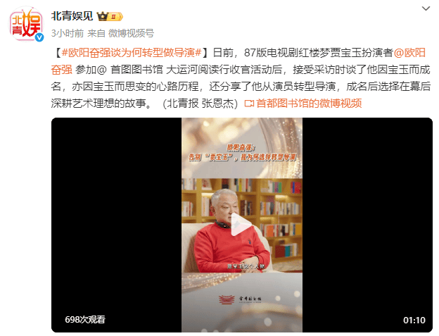 日前,87版电视剧红楼梦贾宝玉扮演者欧阳奋强参加首图图书馆大运河阅读行收官活动后,接受采访时谈了他因宝玉而成名,亦因宝玉而思变的心路历程,还分享了他从演员转型导演,成名后选择在幕后深耕艺术理想的故事。