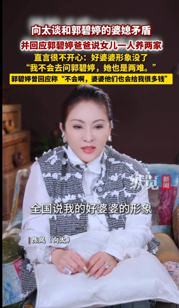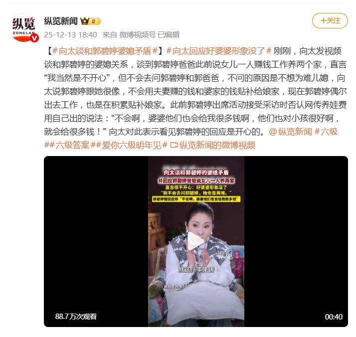 对此,向太在2025年12月13日的回应视频里,没有绕弯子,开门见山表达了不满。但她话锋一转,展现了高段位的处理方式——把委屈吞进自己肚子。理由很“体面”:不想让儿媳郭碧婷为难,夹在亲生父亲和婆家之间做选择。这一下,就从“经济纠纷”拔高到了“情感体谅”的层面。