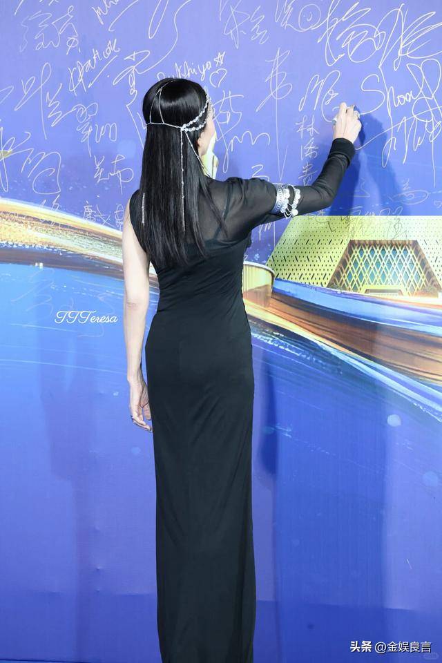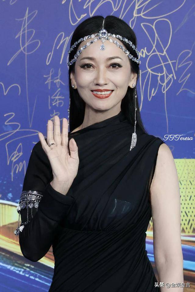 在电影节红毯上,她穿着黑色薄纱礼服,单袖剪裁搭配银色头饰,宛如西域公主。
