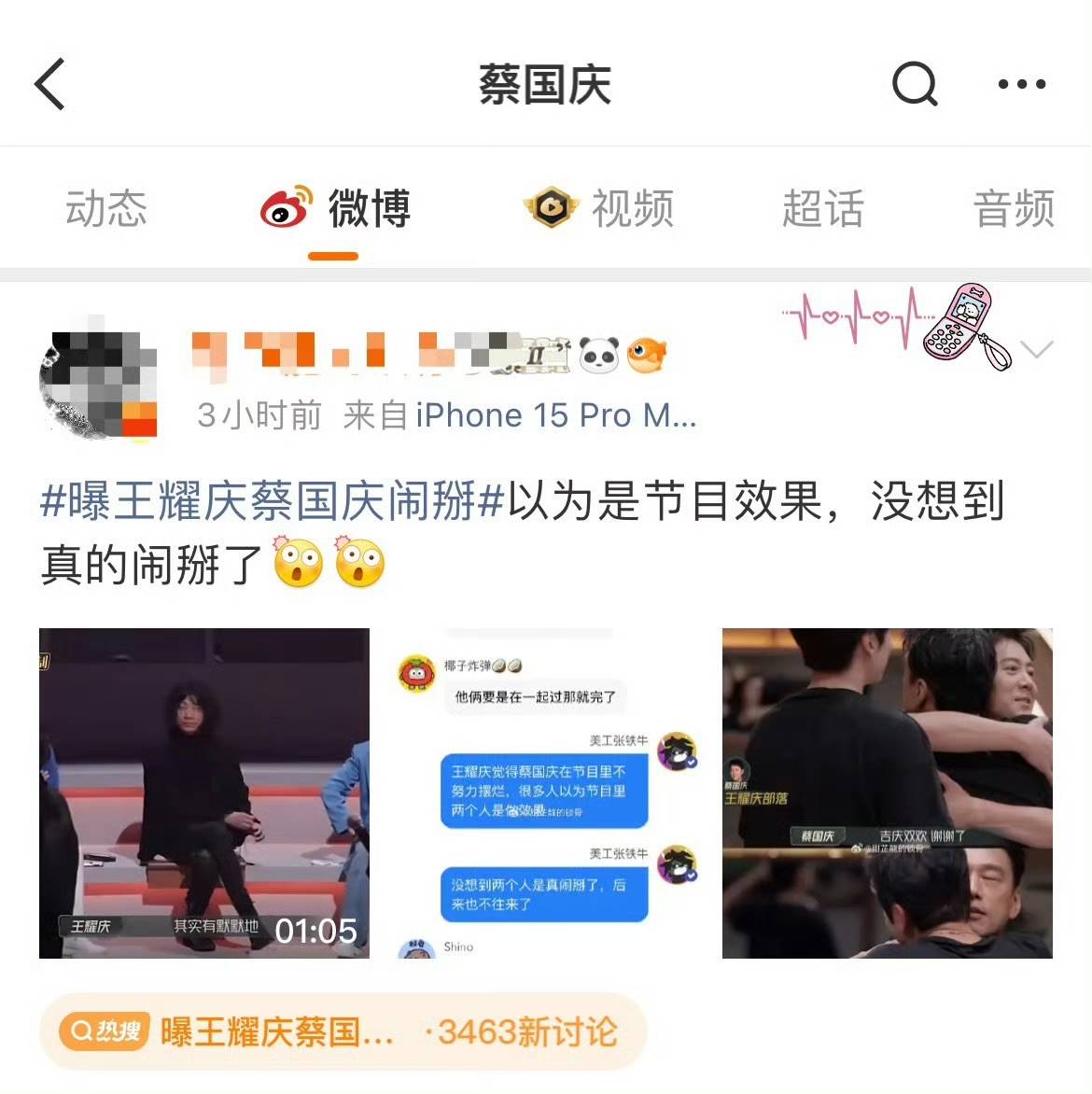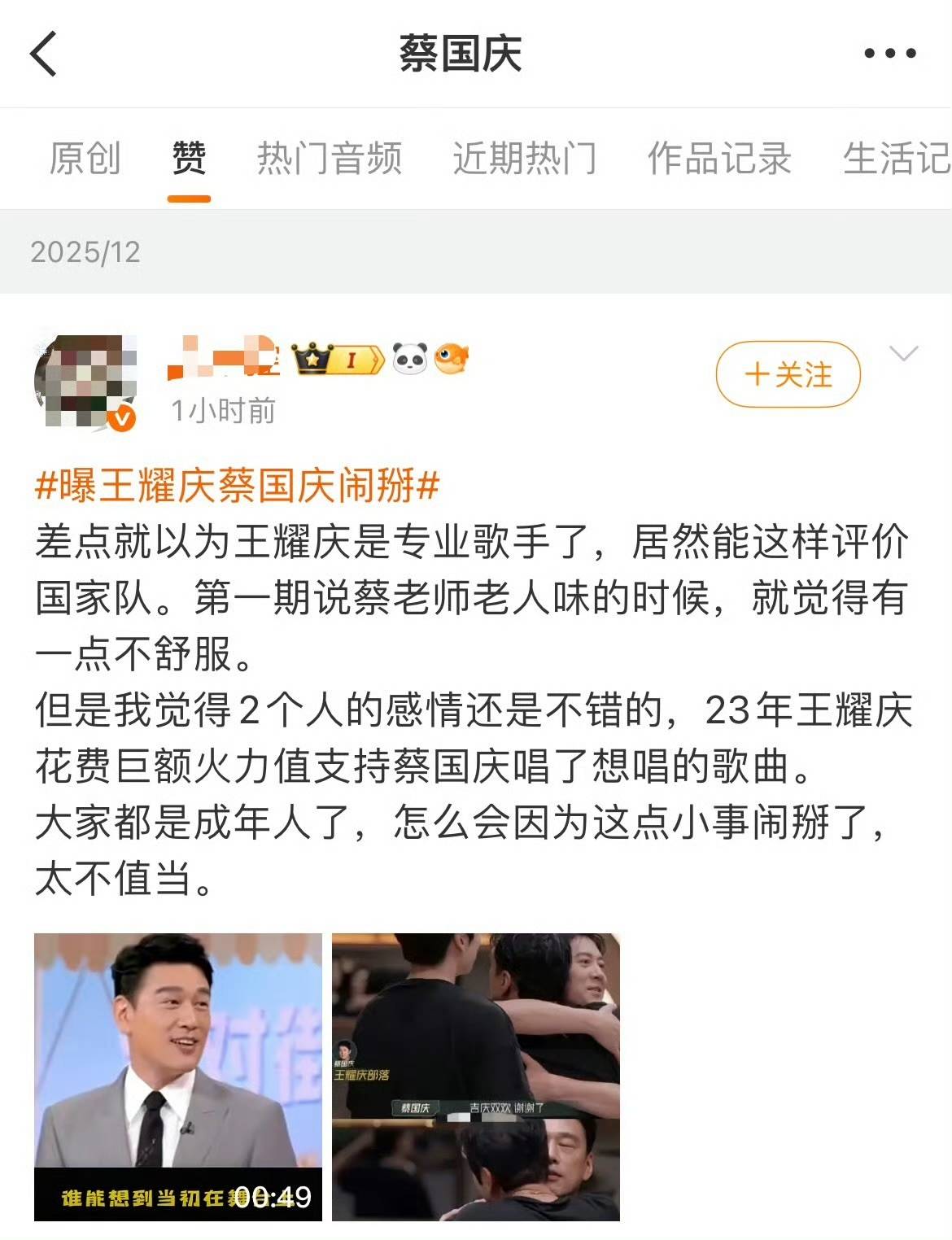 要说这波操作有多迷惑,得先看蔡国庆点赞的两条博文——一条直言“以为是节目效果,没想到真的闹掰了”,字里行间暗示两人关系早已破裂;另一条更狠,直接点名“王耀庆嫌弃蔡国庆实力”,还扒出《披荆斩棘3》里的组队名场面:王耀庆当时以“怕老年人在舞台上摔倒”为由婉拒蔡国庆组队,这话听得人脚趾抠出三室一厅。关键是蔡国庆的账号平时活跃度不低,这波点赞绝对不是手滑误触,明晃晃的操作被网友解读为“变相默认矛盾”,简直是瓜田投下的深水炸弹。