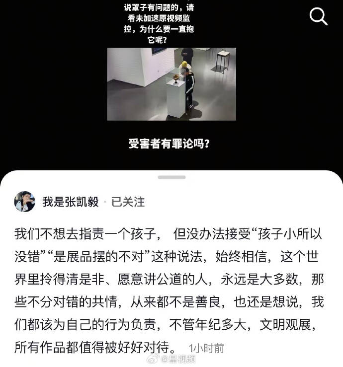 监控画面成了“铁证”。视频清晰显示,男童在“禁止触碰”的标识前,多次用力拖拽防护罩,而一旁的监护人并未及时制止。网友一针见血:“不违规触碰,根本不会倒塌。” 支持者认为,张凯毅“不索赔但追责”的立场堪称清醒——经济损失可由保险兜底,但破坏公共规则的责任必须厘清,这是对文明观展底线的一次郑重提醒。
