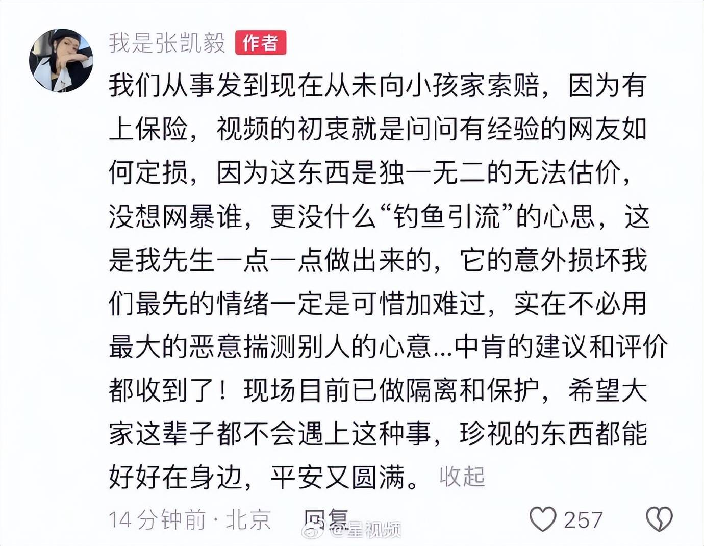 事件发酵后,质疑声随之而来。有网友猜测是否意在“钓鱼引流”,也有人搬出“孩子还小”“展品摆放不当”等说辞。对此,张凯毅迅速回应,公布了现场监控,并明确表态:从事发至今,从未向男童家长提出索赔,因为展品已购买保险;发布视频的初衷,仅仅是求助有经验的网友如何定损和修复。她强调,这件手工制品无法市场定价,修复面临技术周期长、黄金损耗等难题,而自己临近生产,更添心理负担。她最无法接受的,正是那些试图用“孩子无罪论”或“受害者有罪论”来模糊焦点的声音。