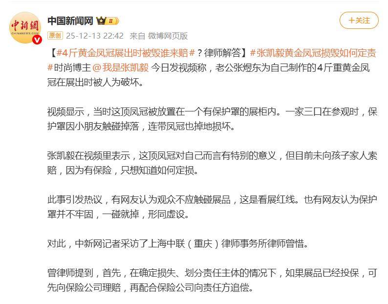 12月13日,知名博主张凯毅发布视频求助,称自家独一无二的黄金凤冠在展览中被毁,心碎不已。据披露,这顶凤冠是其丈夫耗时3个月、用4斤黄金纯手工打造,并镶嵌了4克拉钻戒,是两人从恋爱到婚姻的“爱情信物”,按当前金价估值在110万至130万元之间。在北京某美术馆举办的免费“爱”主题展览中,一名男童反复拖拽、攀抱展台防护罩约25秒,导致罩体与凤冠一同坠落,凤冠严重变形。